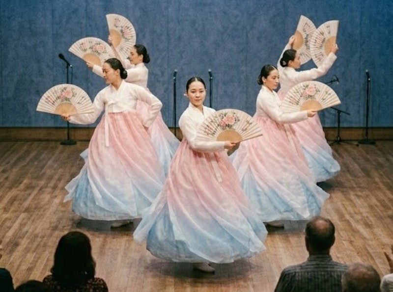 AI-generated illustration of girls performing a traditional Korean fan dance inspired by Arirang.