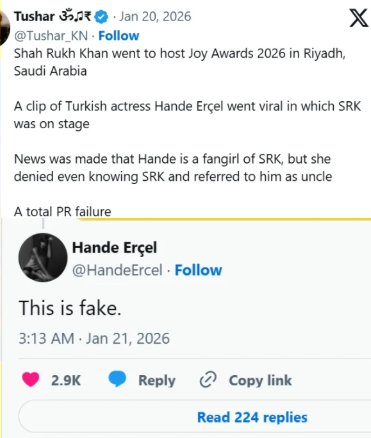 Turkish actress Hande Erçel has been making headlines in India ever since the Joy Awards 2026 in Riyadh on January 17. While her appearance at the star-studded event and interactions with global celebrities drew attention, a social media rumour quickly overshadowed it—claiming she had called Bollywood superstar Shah Rukh Khan “uncle.”