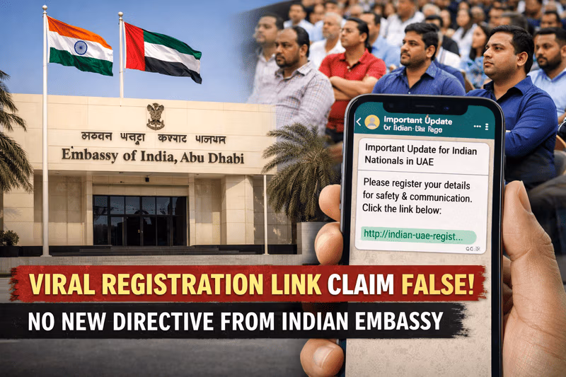 A viral message titled “Important Update for Indian Nationals in UAE” claimed that the Embassy of India in Abu Dhabi had issued a fresh directive urging all Indian nationals residing in the UAE to register their details through a provided link for safety and communication purposes, prompting a surge in traffic that reportedly caused the link to crash.