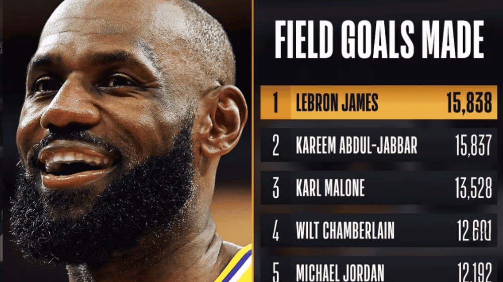 This achievement moves James past Kareem Abdul-Jabbar, who finished his 20-year career with 15,837 field goals. The two legends remain the only players in NBA history to surpass the 15,000 made field goal mark, with Karl Malone sitting third at 13,528. Among active players, Kevin Durant is currently the only one in the top ten.