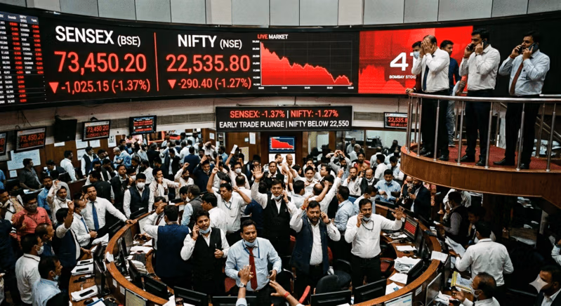 The BSE Sensex dropped more than 1,000 points in early trade, while the Nifty 50 slipped below 22,550, reflecting a decisive shift in investor sentiment toward risk aversion. The sell-off, described by market participants as a “Black Monday” moment, comes amid escalating geopolitical tensions, rising crude oil prices, and persistent outflows of foreign capital.