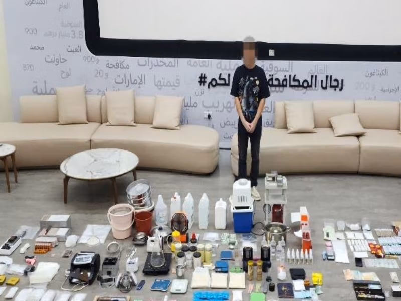 A search of the villa uncovered 40 kilograms of illegal substances, including ketamine, crystal meth, marijuana, hashish oil, and other chemicals and liquids used in drug production and trafficking.
